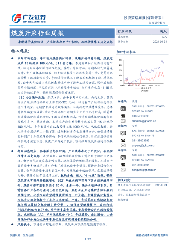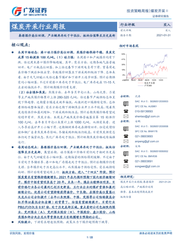 【广发证券】【20210131】20210131-广发证券-煤炭开采行业周报:秦港煤价高位回调,产业链库存处于中低位,板块估值降至历史底部-22页