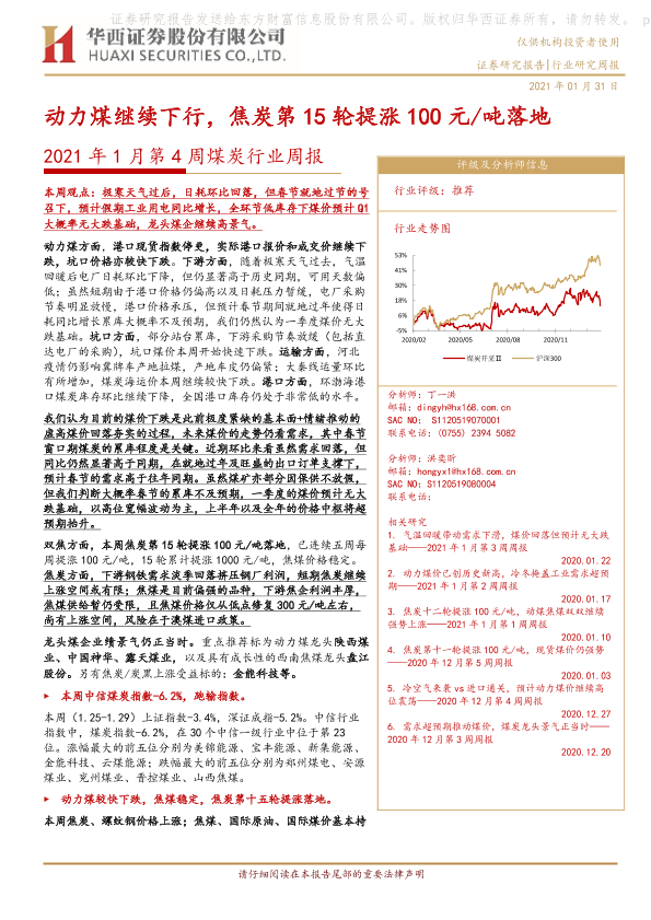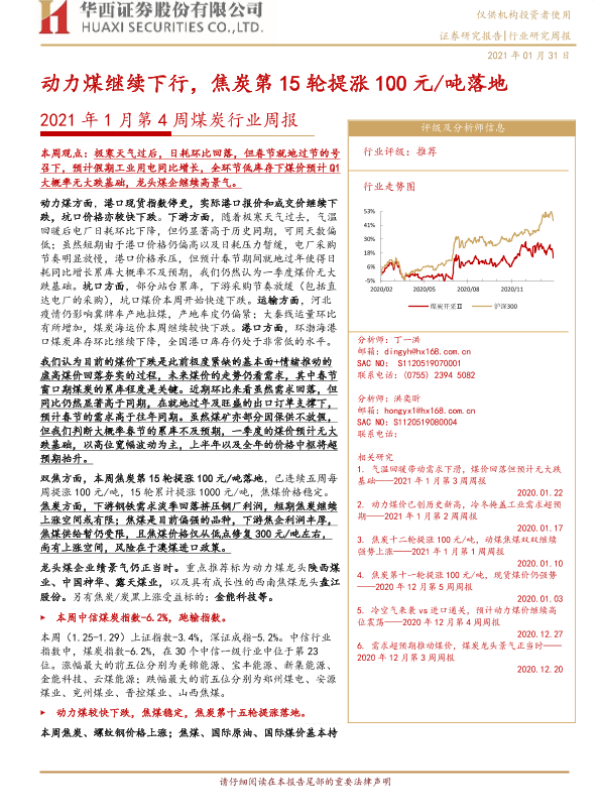 【华西证券】【20210131】2021年1月第4周煤炭行业周报:动力煤继续下行,焦炭第15轮提涨100元/吨落地-22页