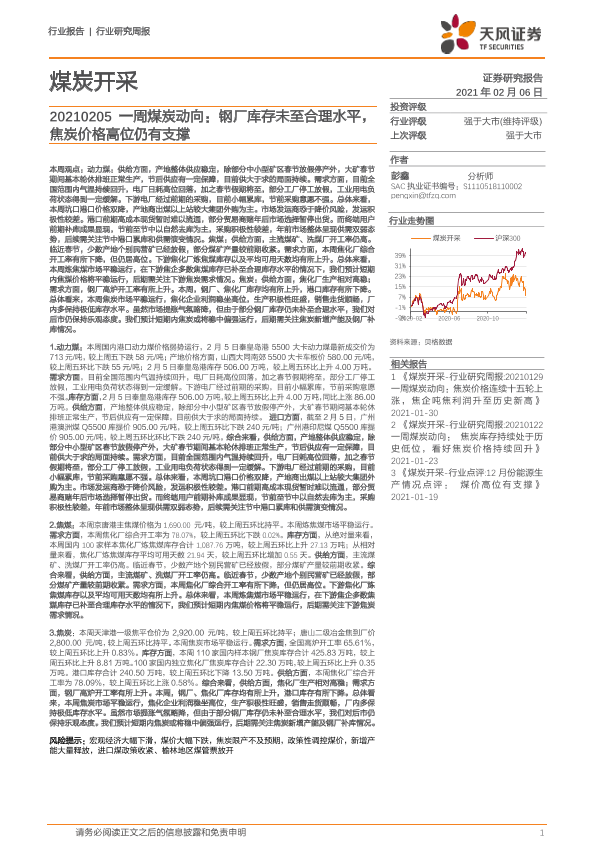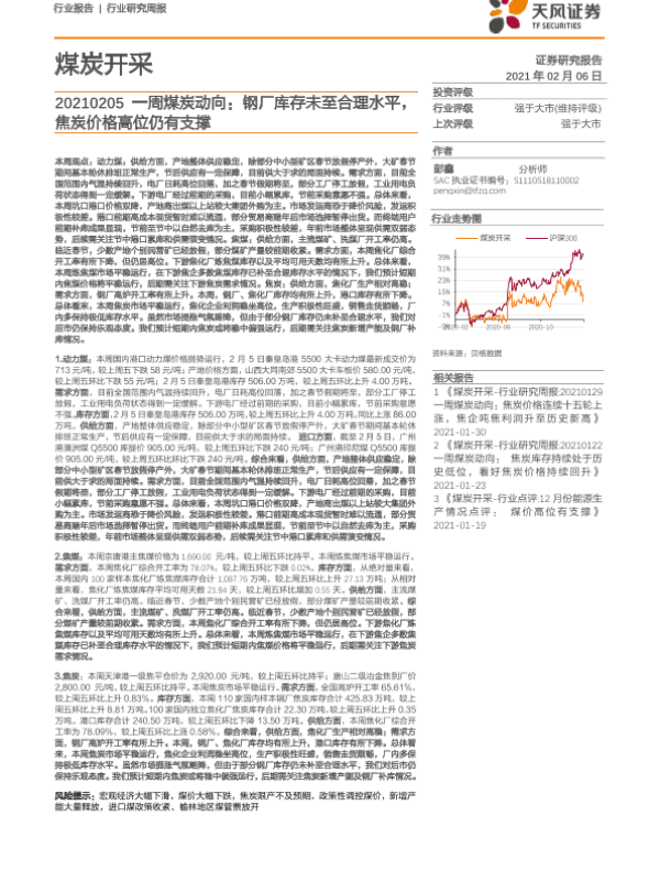 【天风证券】【20210206】20210206-天风证券-煤炭开采:一周煤炭动向:钢厂库存未至合理水平,焦炭价格高位仍有支撑-19页