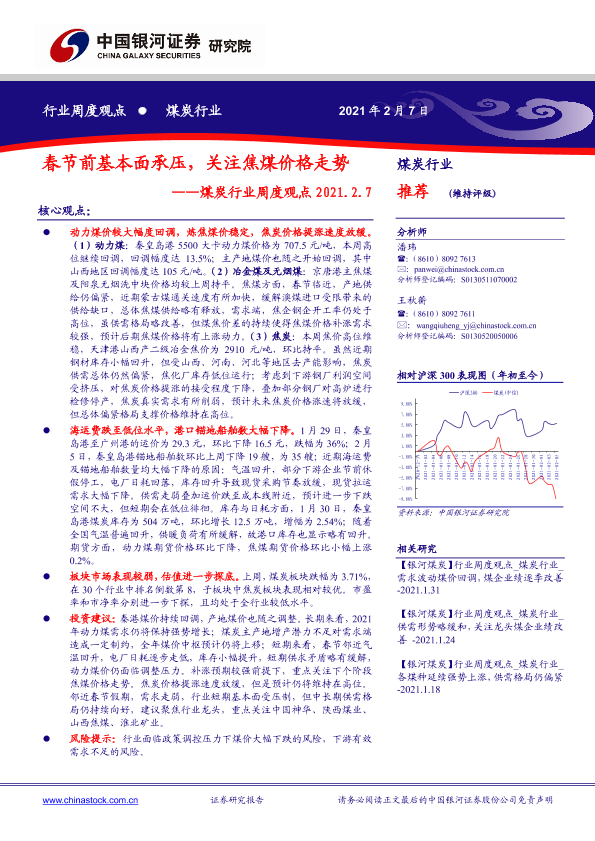 【银河证券】【20210207】中国银河-煤炭行业周度观点:春节前基本面承压,关注焦煤价格走势-14页