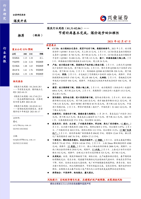 【兴业证券】【20210207】煤炭行业周报(01.31-02.06)——节前补库基本完成,煤价逐步回归理性-14页