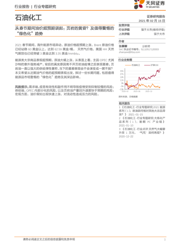 【天风证券】【20210215】20210215-天风证券-石油化工行业专题研究:从春节期间油价超预期谈起:页岩的黄昏?及值得警惕的“绿色化”趋势-5页
