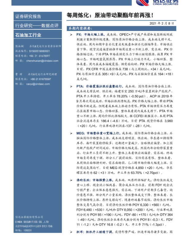 【信达证券】【20210208】每周炼化:原油带动聚酯年前再涨!-9页