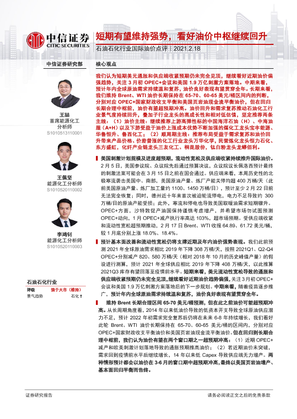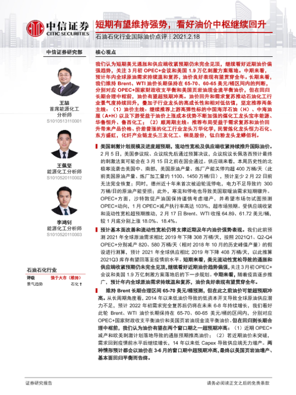 【中信证券】【20210218】石油石化行业国际油价点评:短期有望维持强势,看好油价中枢继续回升-4页