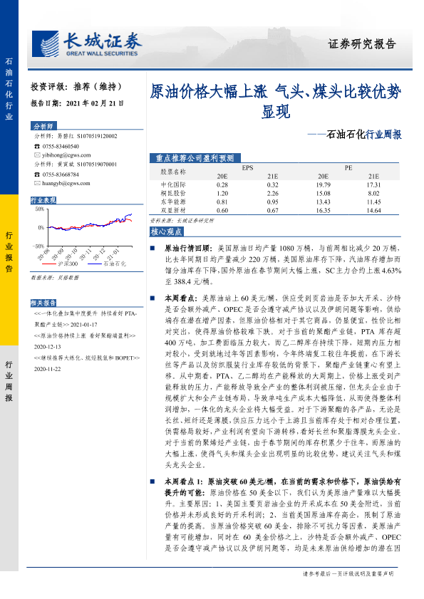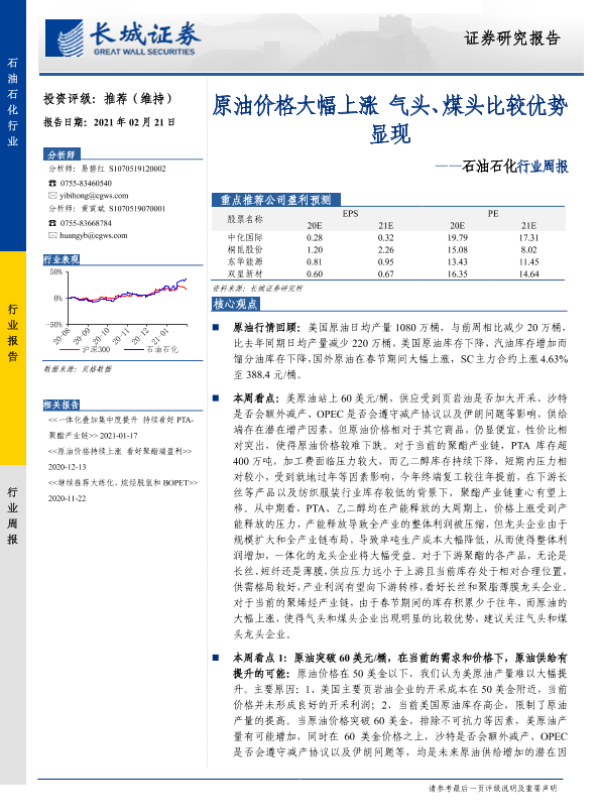【长城证券】【20210221】20210221-长城证券-石油石化行业周报:原油价格大幅上涨 气头、煤头比较优势显现-10页