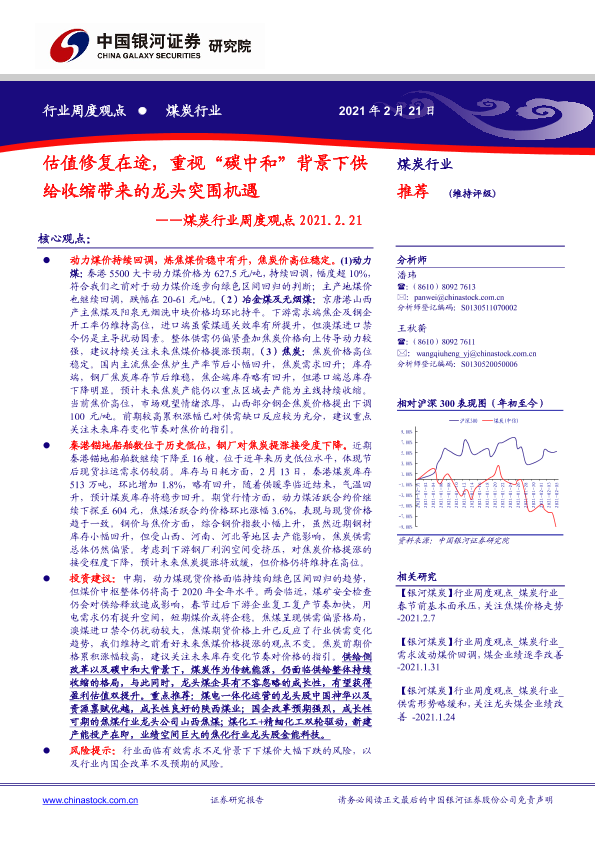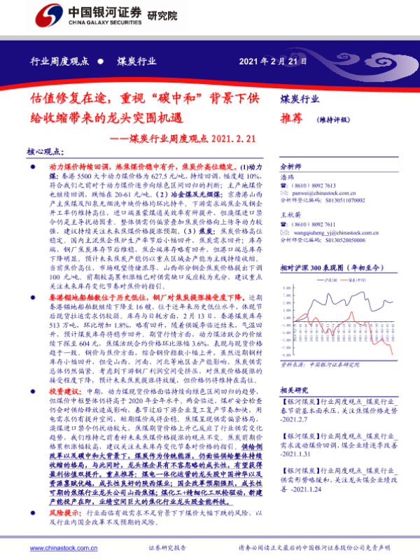 【银河证券】【20210221】20210221-中国银河-煤炭行业周度观点:估值修复在途,重视“碳中和”背景下供给收缩带来的龙头突围机遇-14页