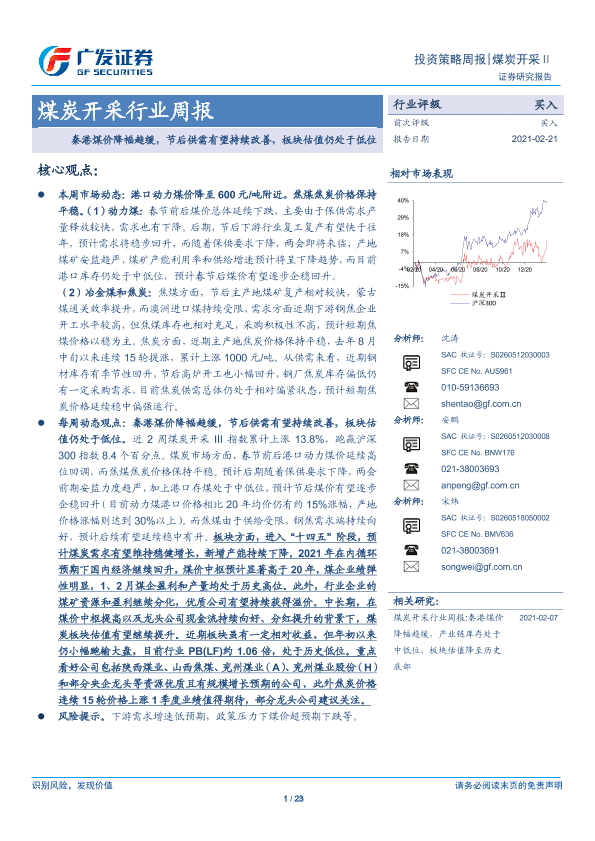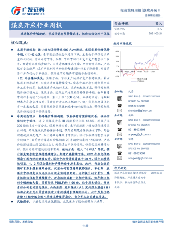【广发证券】【20210221】20210221-广发证券-煤炭开采行业周报:秦港煤价降幅趋缓,节后供需有望持续改善,板块估值仍处于低位-23页