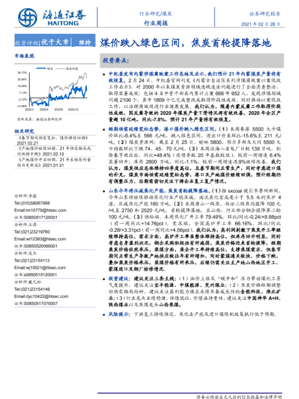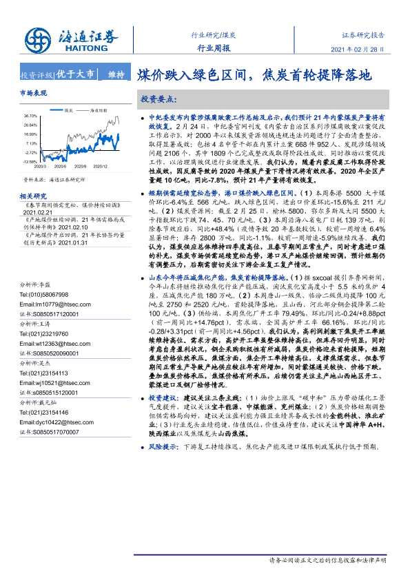 【海通证券】【20210228】煤炭行业周报:煤价跌入绿色区间,焦炭首轮提降落地-2页