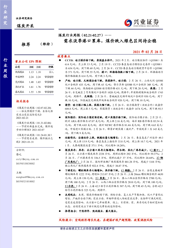 【兴业证券】【20210228】煤炭行业周报(02.21-02.27)——需求淡季港口累库,煤价跌入绿色区间待企稳-13页
