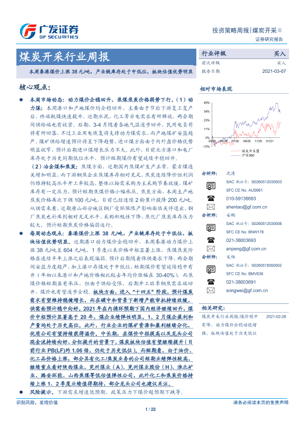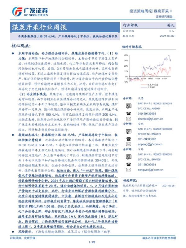 【广发证券】【20210307】20210307-广发证券-煤炭开采行业周报:本周秦港煤价上涨38元 吨,产业链库存处于中低位,板块估值优势明显-22页