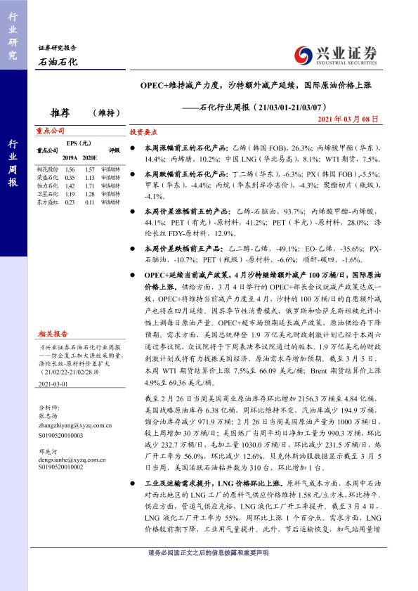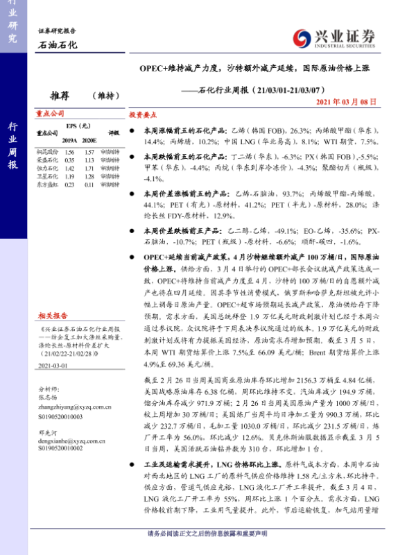 【兴业证券】【20210308】20210308-兴业证券-石化行业周报:OPEC+维持减产力度,沙特额外减产延续,国际原油价格上涨-14页