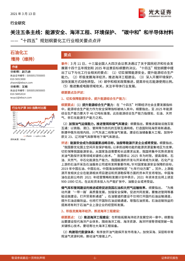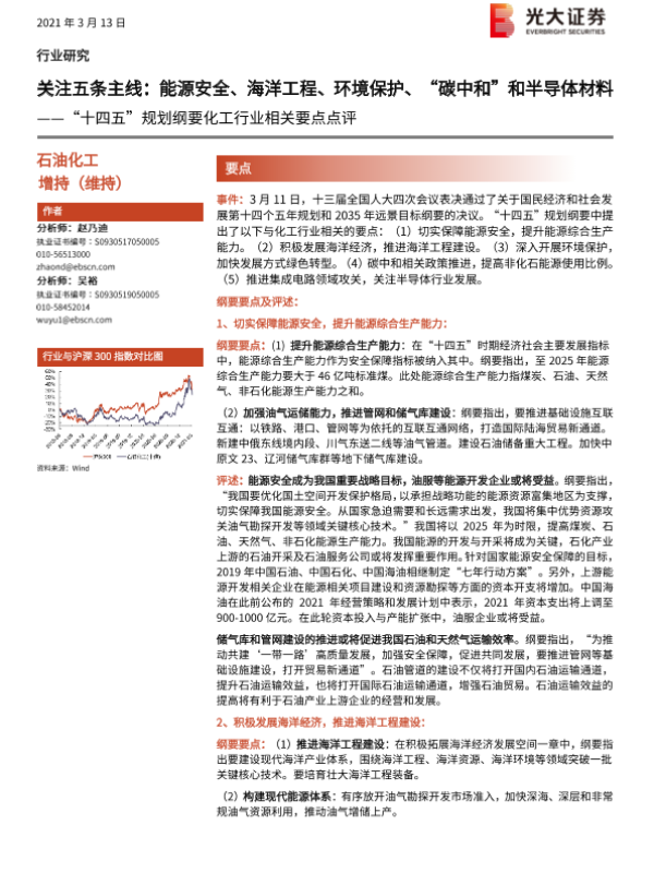 【光大证券】【20210313】石油化工行业:“十四五”规划纲要化工行业相关要点点评:关注五条主线:能源安全、海洋工程、环境保护、“碳中和”和半导体材料-5页