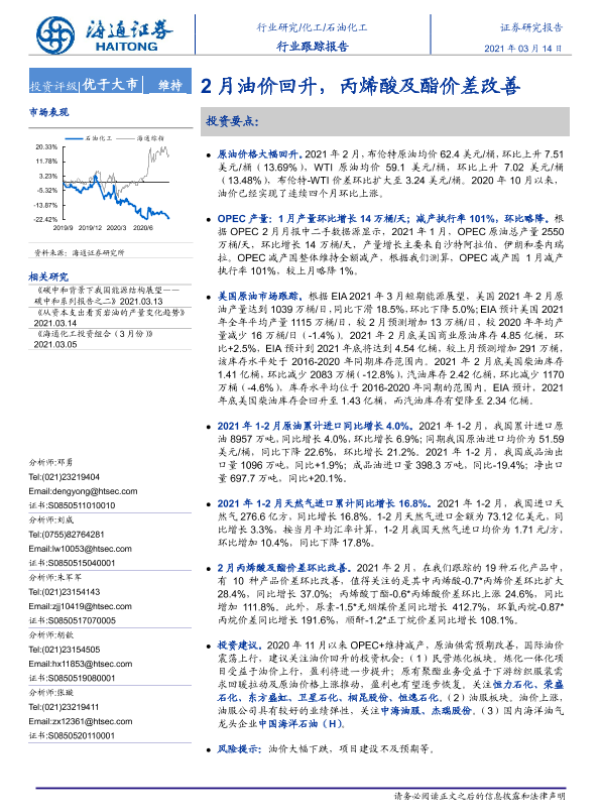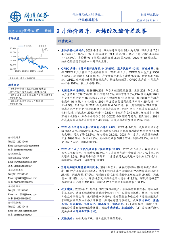 【海通证券】【20210314】20210314-海通证券-石油化工行业跟踪报告:2月油价回升,丙烯酸及酯价差改善-7页