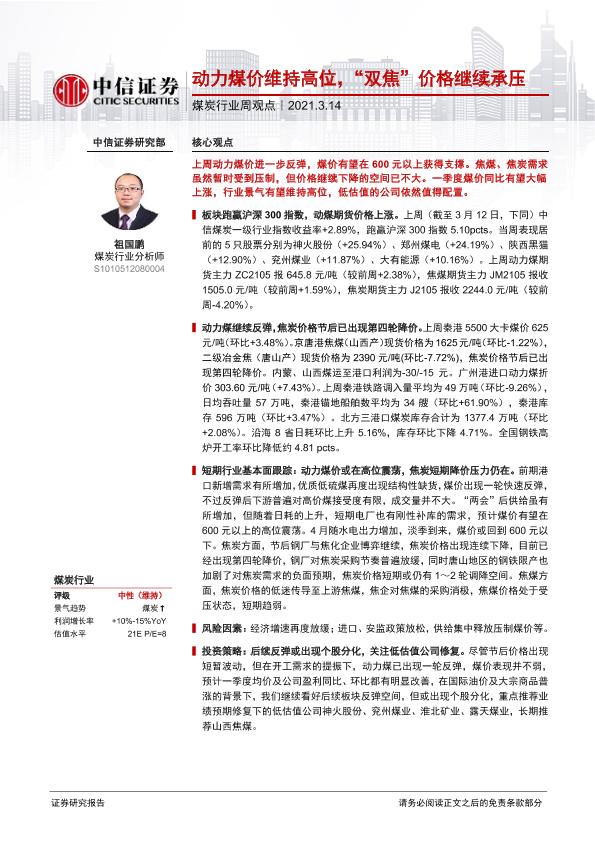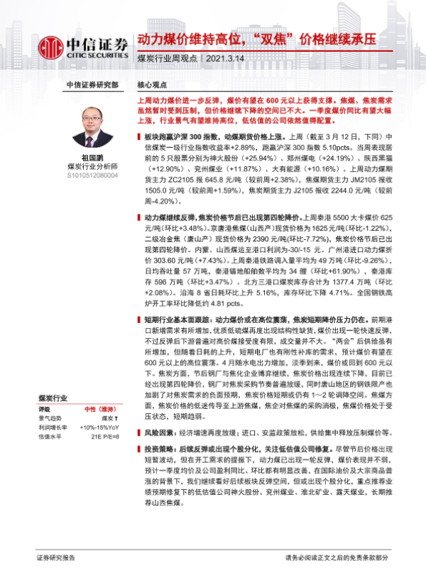 【中信证券】【20210314】20210314-中信证券-煤炭行业周观点:动力煤价维持高位,“双焦”价格继续承压-8页