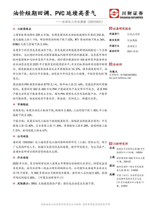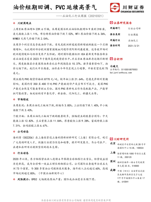 【川财证券】【20210321】20210321-川财证券-石油化工行业周报:油价短期回调、PVC延续高景气-12页