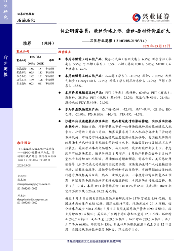 【兴业证券】【20210315】20210315-兴业证券-石化行业周报:纺企刚需备货,涤丝价格上涨,涤丝-原材料价差扩大-13页