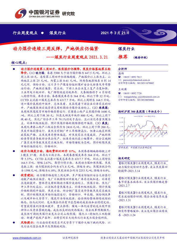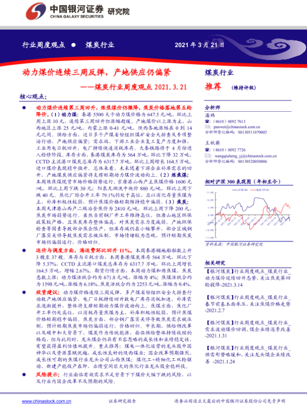 【银河证券】【20210321】20210321-中国银河-煤炭行业周度观点:动力煤价连续三周反弹,产地供应仍偏紧-14页