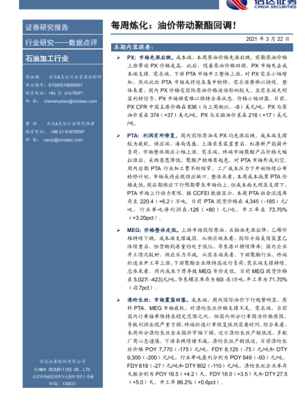 【信达证券】【20210322】每周炼化:油价带动聚酯回调!-9页