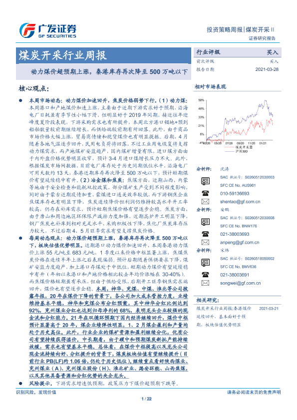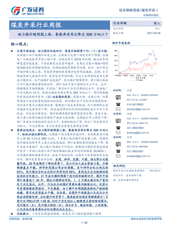 【广发证券】【20210328】20210328-广发证券-煤炭开采行业周报:动力煤价超预期上涨,秦港库存再次降至500万吨以下-22页