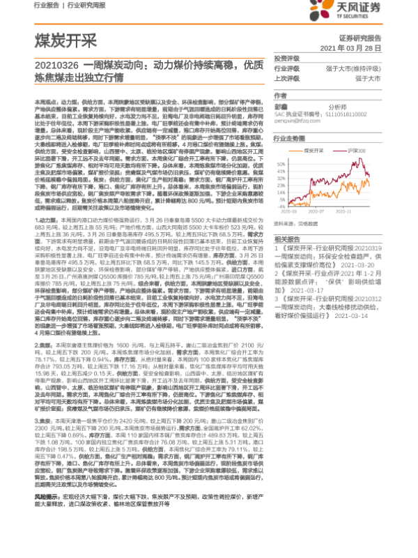 【天风证券】【20210328】20210328-天风证券-一周煤炭动向:动力煤价持续高稳,优质炼焦煤走出独立行情-19页