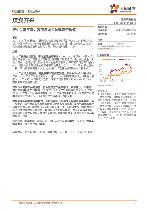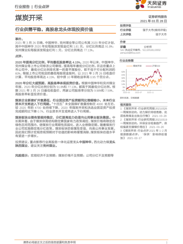 【天风证券】【20210328】20210328-天风证券-煤炭开采行业点评:行业供需平稳,高股息龙头体现投资价值-7页