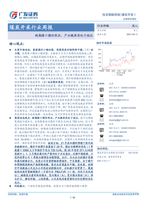 【广发证券】【20210411】20210411-广发证券-煤炭开采行业周报:短期港口煤价承压,产业链库存处于低位-22页