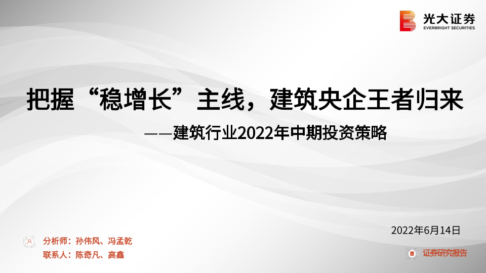 【光大证券】【20220614】建筑行业2022年中期投资策略:把握“稳增长”主线,建筑央企王者归来-47页