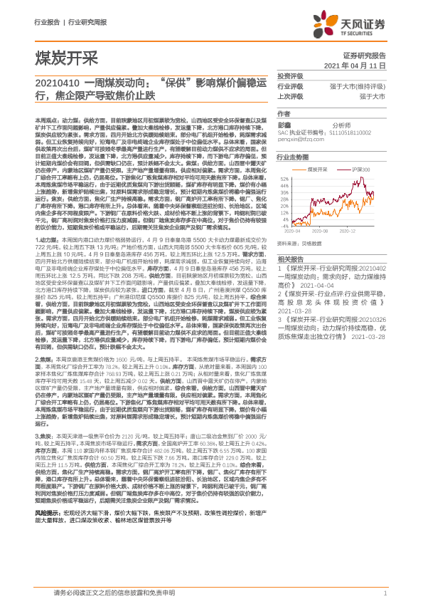 【天风证券】【20210411】20210411-天风证券-煤炭开采行业:一周煤炭动向:“保供”影响煤价偏稳运行,焦企限产导致焦价止跌-19页