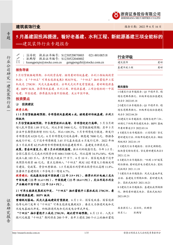【浙商证券】【20220616】建筑装饰行业专题报告:5月基建固投再提速,看好老基建、水利工程、新能源基建三项全能标的-35页