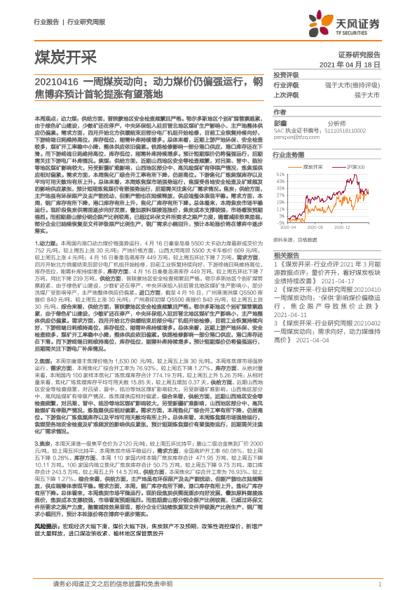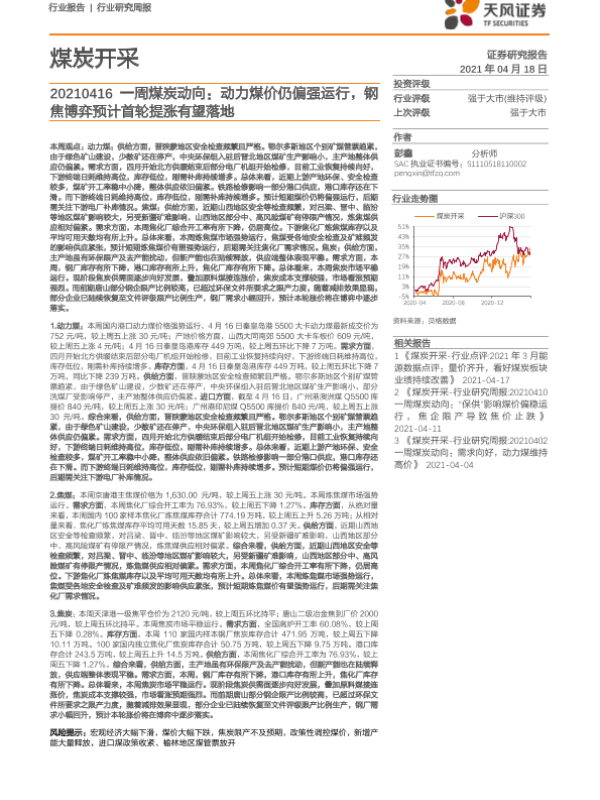 【天风证券】【20210418】20210418-天风证券-一周煤炭动向:动力煤价仍偏强运行,钢焦博弈预计首轮提涨有望落地-19页