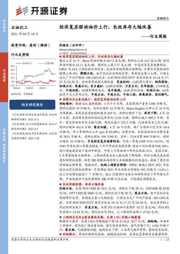 【开源证券】【20210418】石油化工行业周报:经济复苏驱动油价上行,长丝库存大幅改善-23页
