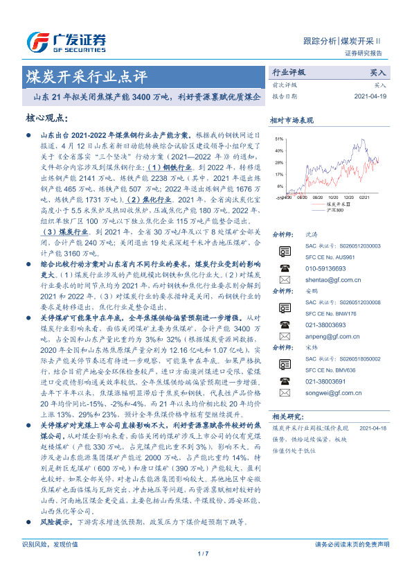 【广发证券】【20210419】20210419-广发证券-煤炭开采行业点评:山东21年拟关闭焦煤产能3400万吨,利好资源禀赋优质煤企-7页