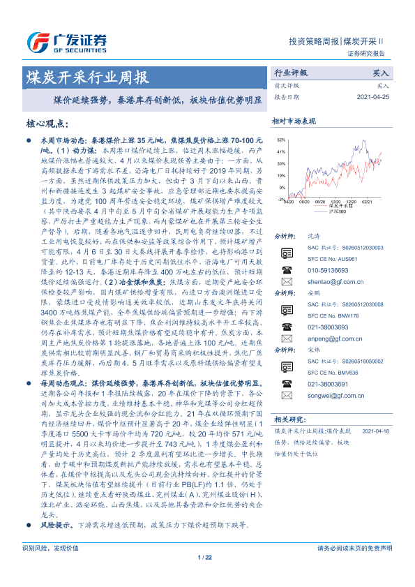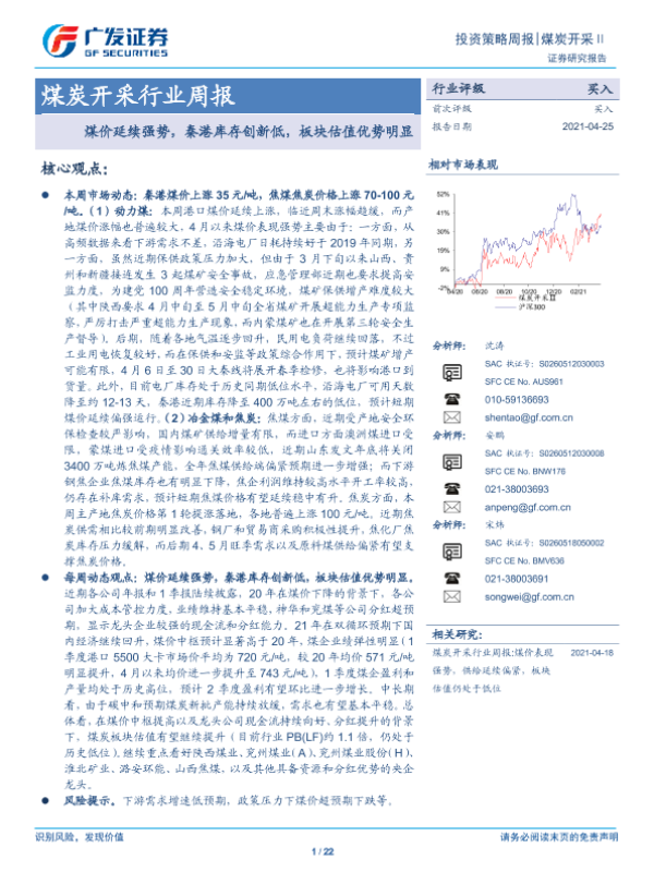 【广发证券】【20210425】20210425-广发证券-煤炭开采行业周报:煤价延续强势,秦港库存创新低,板块估值优势明显-22页