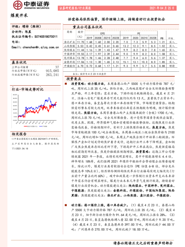 【中泰证券】【20210425】20210425-中泰证券-煤炭开采行业周报:供需格局依然偏紧,煤价继续上涨,持续看好行业投资机会-14页