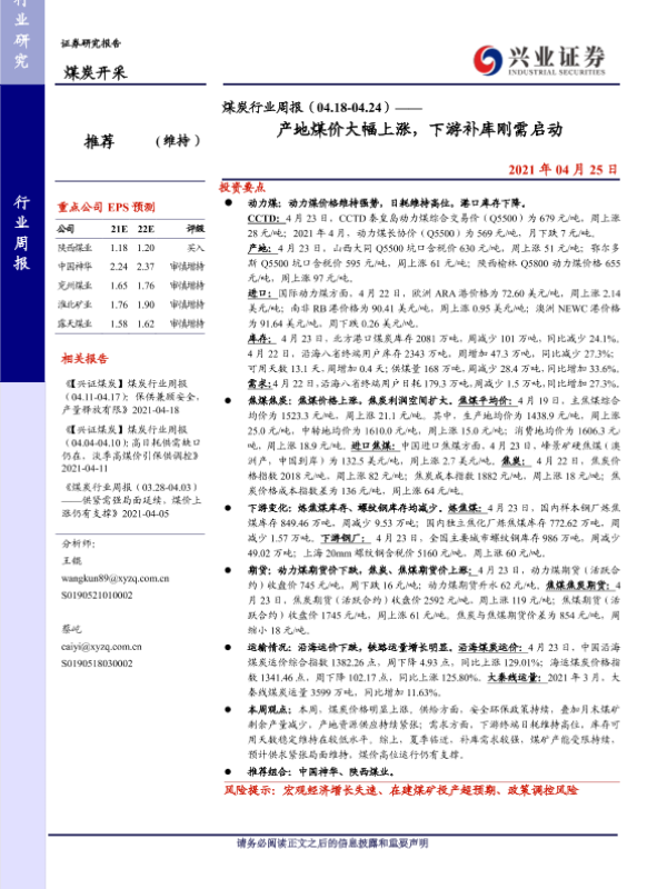 【兴业证券】【20210425】煤炭行业周报(04.18-04.24)——产地煤价大幅上涨,下游补库刚需启动-10页