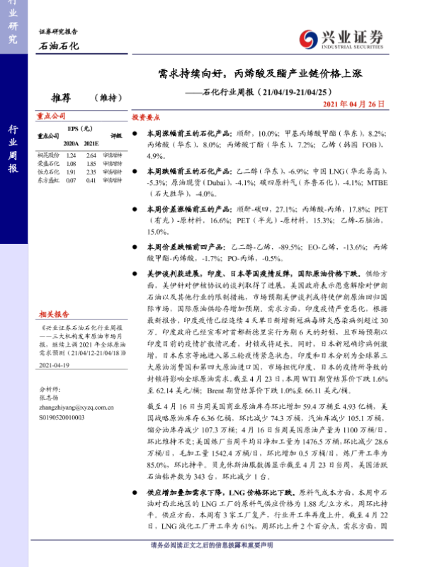 【兴业证券】【20210426】20210426-兴业证券-石化行业周报:需求持续向好,丙烯酸及酯产业链价格上涨-13页
