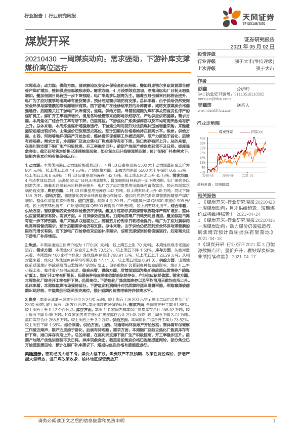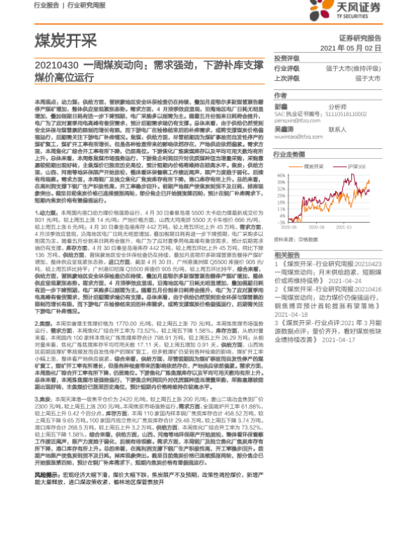 【天风证券】【20210502】20210502-天风证券-一周煤炭动向:需求强劲,下游补库支撑煤价高位运行-20页
