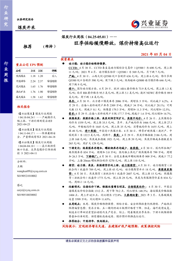 【兴业证券】【20210504】煤炭行业周报(04.25-05.01)——旺季供给缓慢释放,煤价持续高位运行-10页