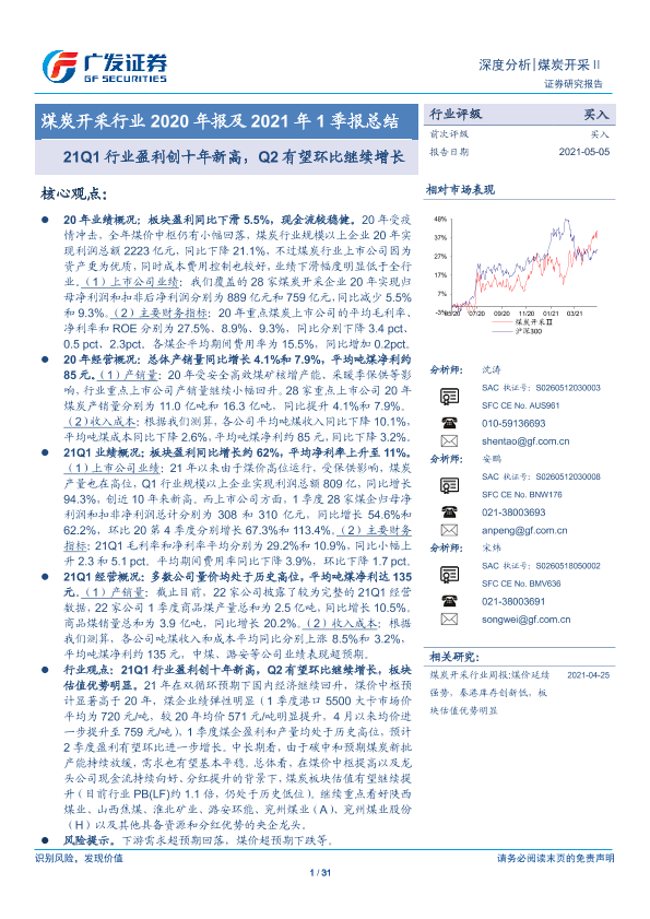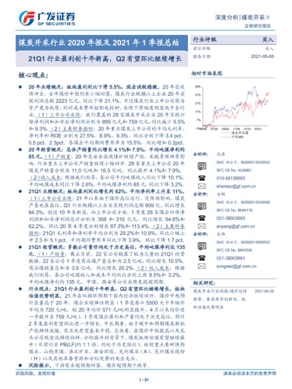 【广发证券】【20210505】煤炭开采行业2020年报及2021年1季报总结:21Q1行业盈利创十年新高,Q2有望环比继续增长-31页