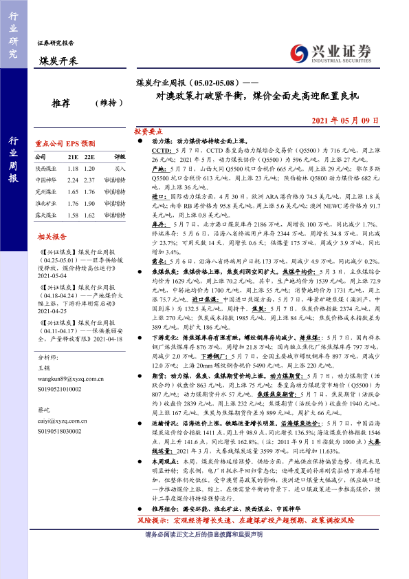 【兴业证券】【20210509】煤炭行业周报(05.02-05.08)——对澳政策打破紧平衡,煤价全面走高迎配置良机-10页