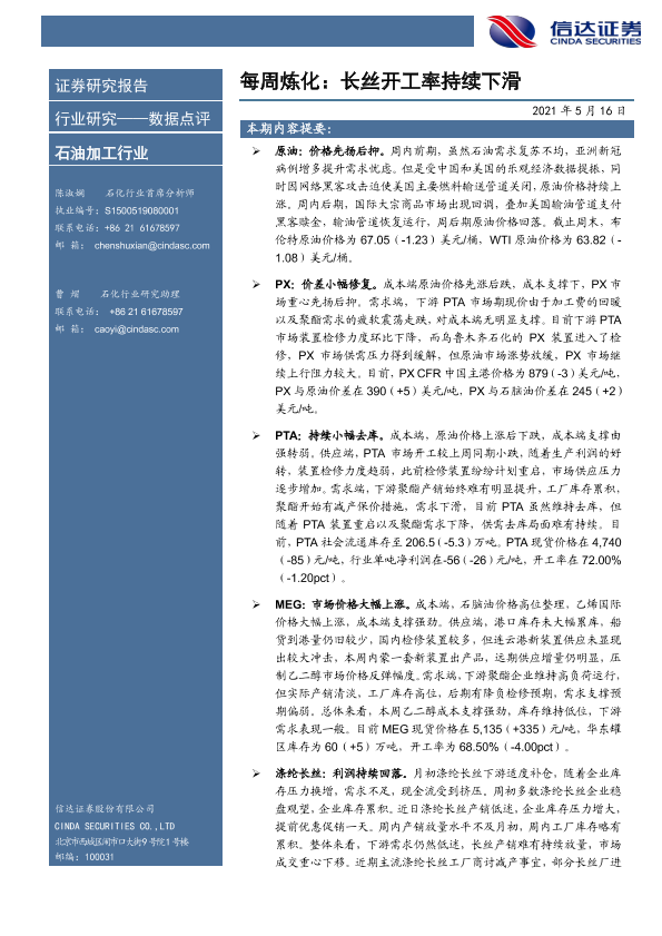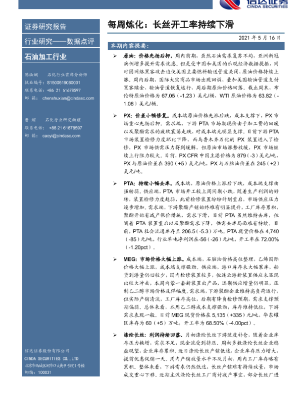 【信达证券】【20210516】每周炼化:长丝开工率持续下滑-9页