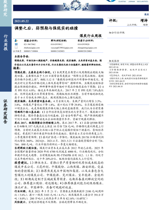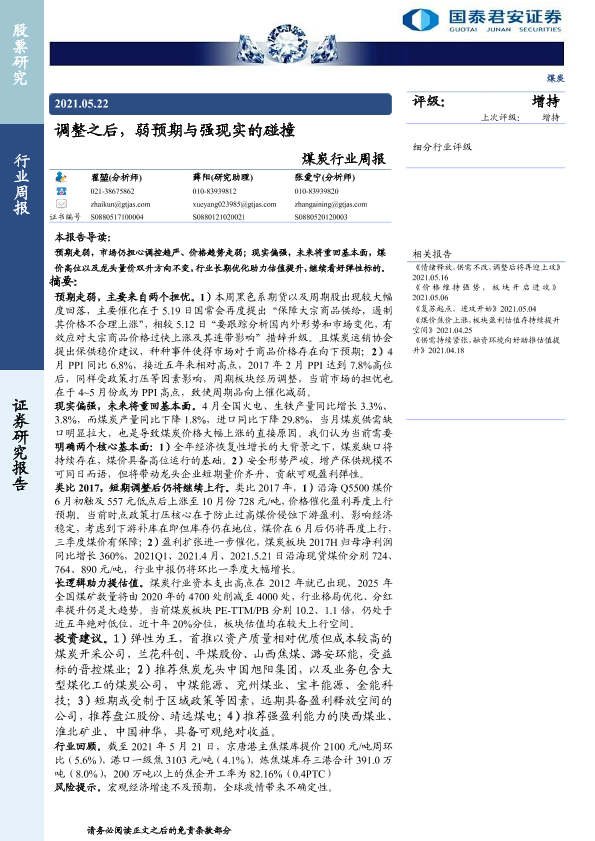 【国泰君安证券】【20210522】20210522-国泰君安-煤炭行业周报:调整之后,弱预期与强现实的碰撞-20页