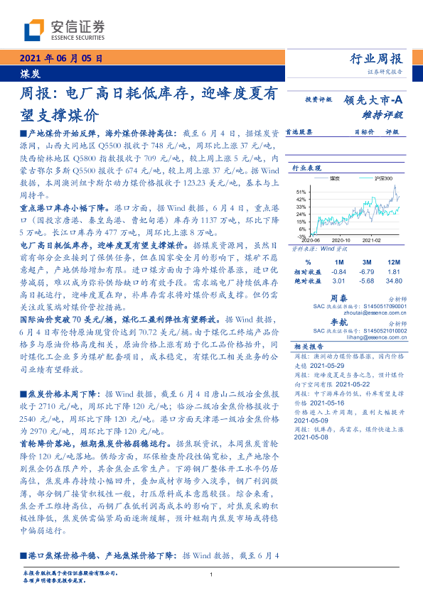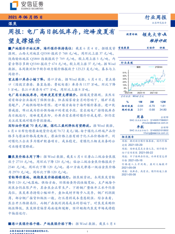 【安信证券】【20210605】20210605-安信证券-煤炭周报:电厂高日耗低库存,迎峰度夏有望支撑煤价-21页
