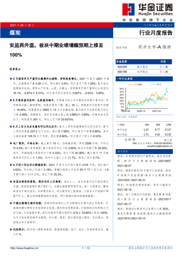 【华金证券】【20210618】20210618-华金证券-煤炭行业月度报告:安监再升温,板块中期业绩增幅预期上修至100%-13页