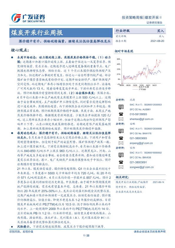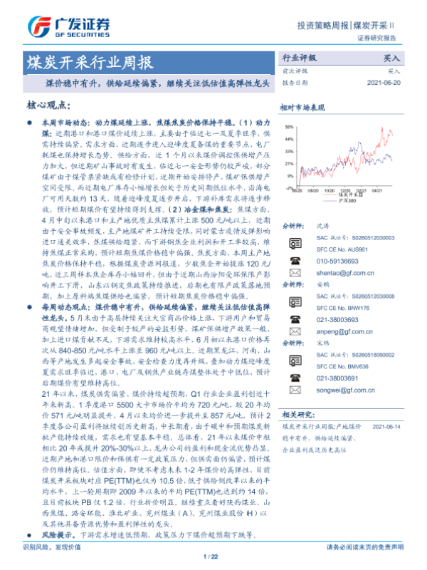 【广发证券】【20210620】20210620-广发证券-煤炭开采行业周报:煤价稳中有升,供给延续偏紧,继续关注低估值高弹性龙头-22页
