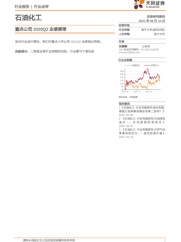 【天风证券】【20210624】石油化工行业:重点公司2020Q2业绩展望-3页
