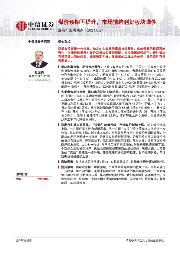 【中信证券】【20210627】煤炭行业周观点:煤价预期再提升,市场情绪利好板块弹性-7页