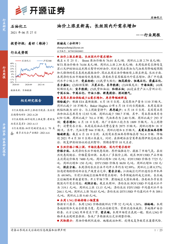 【开源证券】【20210627】石油化工行业周报:油价上涨至新高,长丝国内外需求增加-23页
