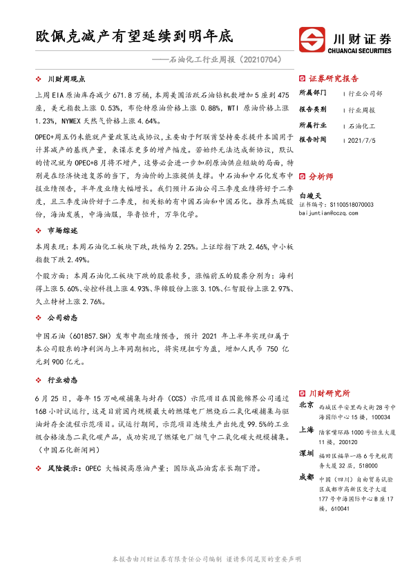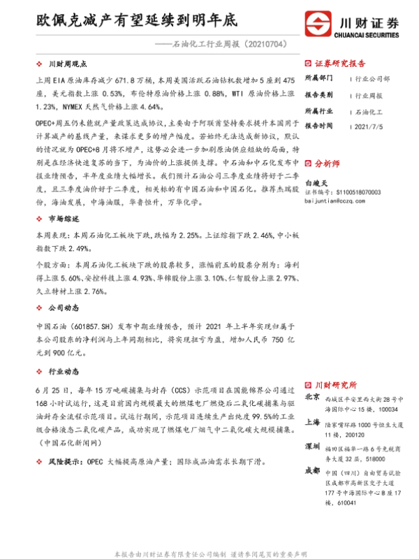 【川财证券】【20210705】20210704-川财证券-石油化工行业周报:欧佩克减产有望延续到明年底-12页