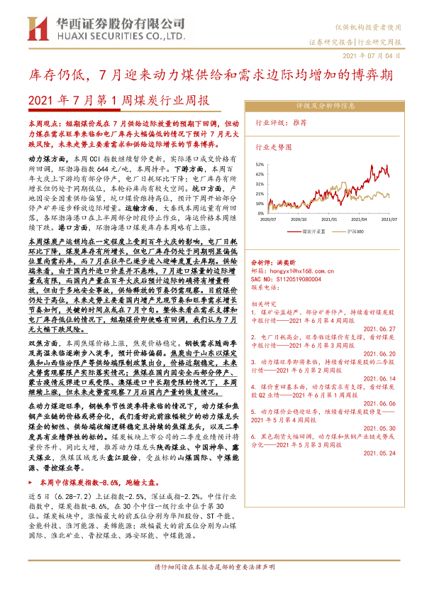 【华西证券】【20210704】2021年7月第1周煤炭行业周报:库存仍低,7月迎来动力煤供给和需求边际均增加的博弈期-22页